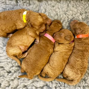 We’re excited to announce that Lucky has given birth to a litter of 5 red Cockapoo puppies. Ready to leave for their forever homes when they are 8 weeks old on the 8th April 2023.